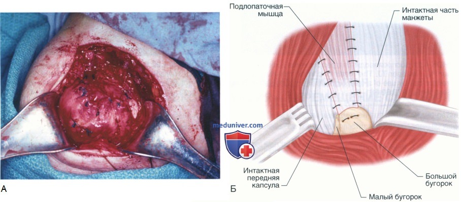 - Подлопаточная мышца перемещается вверх, закрывая остаточный дефект ротаторной манжеты. Верхний край сухожилия подшивается к манжете, латеральный край — к большому бугорку, нижний край — к верхней границе передней капсулы (рис. 25, А и Б)